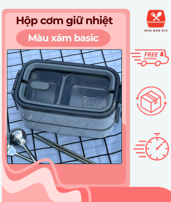 Hộp cơm giữ nhiệt Măm Măm Box với thiết kế màu xám basic hiện đại, phù hợp cho mọi đối tượng từ học sinh, sinh viên đến dân văn phòng.